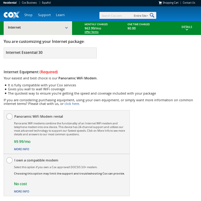 The first picture here is a screen shot of what I keep getting. When I click ORDER NOW I would expect it to take me to an order screen for an upgraded Internet service that would increase the $42.99/mo price, that I am currently paying for the minimum service, to $47.99. I click it and log in and get a page that has a Continue to Checkout button at the bottom. However, if you assume this took you to the offer they presented without paying close attention, You are going to get tricked into a much higher price. Look at the MONTHLY CHARGES price at the top of the page in the second screen shot: $63.99/mo. That's a $21.00 increase, not a $5.00 one.